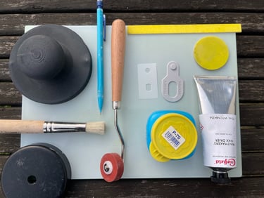 plusieurs plaques (14x14cm) linoléum, peuplier, gelly plate, carton…
